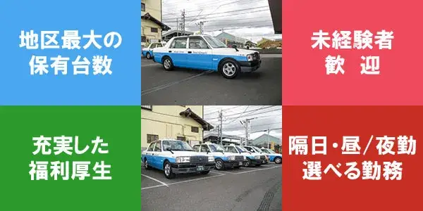 | 募集職種 | タクシードライバー 入社支援特典/超フレックス制度/未経験歓迎 |